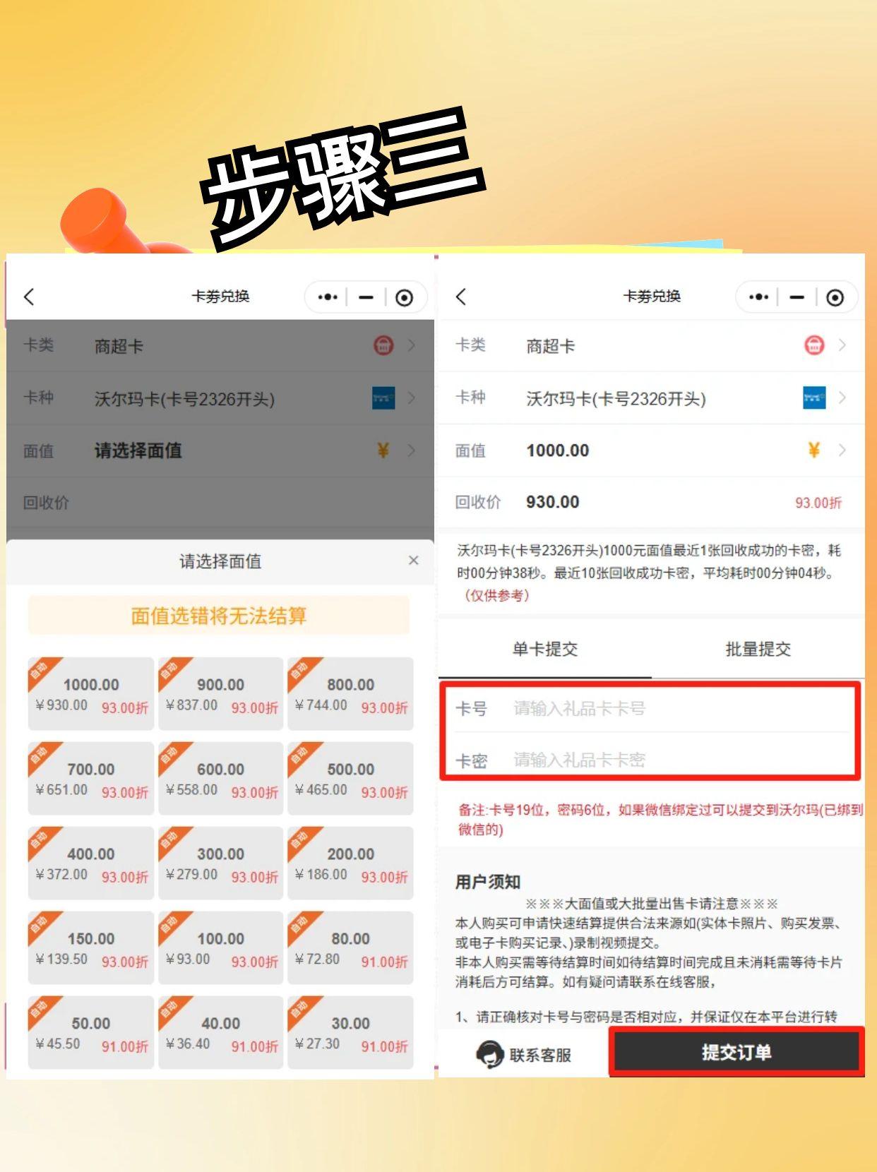 步骤3:根据实际持有的沃尔玛购物卡面值选择匹配选项,仔细填写卡号与密码,确认无误后点击【提交订单】,等待系统自动结算到账;